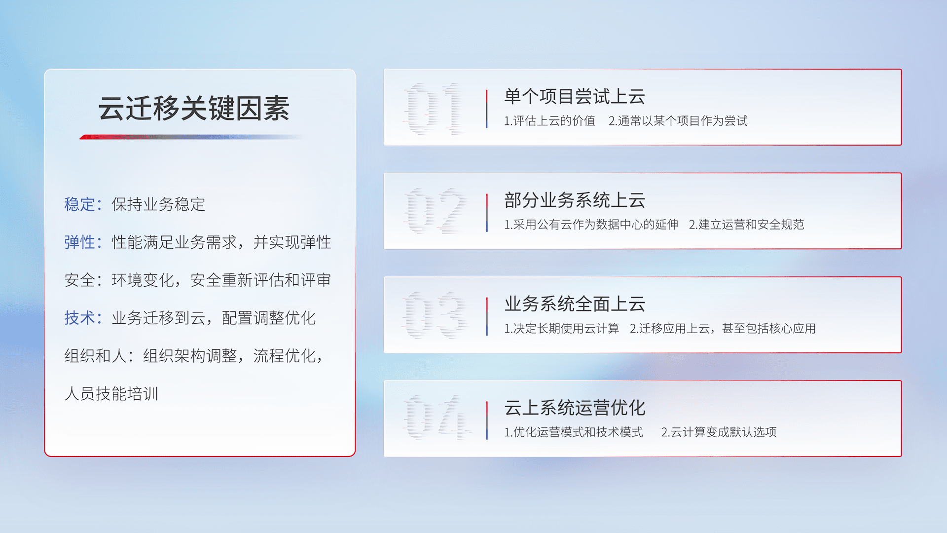 结合实际业务,,,,从规划设计、、云平台选型、、、、云原生改造、、数据迁移、、集成交付,,,,迁移全过程为客户识别最佳上云路径,,,,做好风险识别管理,,设计网络架构、、、、身份权限、、、安全审计合规、、、操作审计、、、、日志审计、、、监控告警策略、、、多站点容灾设计等,,对云上基础设施进行整体规划,,,提升IT治理水平,,,,以满足弹性、、、、高可用、、、高性能的需求。。。。